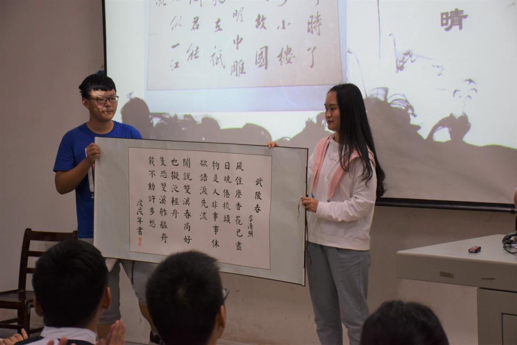此次结课还安排了学生作业展示环节。据悉,虽然《中国古代文学作品选》是本学期才开设的课程,但薛梅在上个学期末便早早给同学们布置了宋词书法、设计、朗诵等作业,大家都戏称“未见其人,先见其作业”。课程结束后,薛梅老师精选了同学们的优秀作品,并私人出资提前装裱,在结课课堂上进行展示。此外,她还展示了同学们拍的微电影的精彩剪辑,同学们各式各样的演绎方式,引得台下掌声和欢呼连绵不断,现场气氛十分活跃。据了解,本学期,薛梅还将同学们分成若干组,把课堂上讲的文学作品如《西厢记》《窦娥冤》《三国演义》等拍成微电影,“通过拍微电影这种形式,既能使学生更深入地理解作品,也能让他们在实践中提升自己的专业能力。”