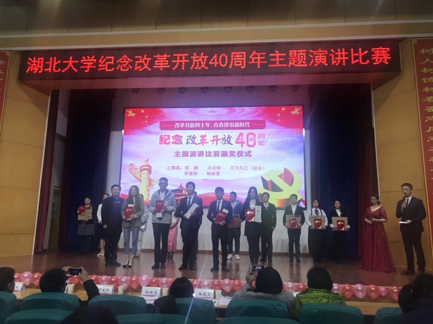 12月6日晚,湖北大学“庆祝改革开放四十周年”演讲比赛决赛在湖北大学商学院三楼报告厅举行。来自A级内射毛片免费的求索苑2018级哲学专业的艾力凡江·艾买尔四人团队(艾力凡江·艾买尔、杨涵琳、胡曼迪、李鸿滨)荣获二等奖和最佳人气奖,A级内射毛片免费的习坎苑2018级历史师范类专业的王慧敏获三等奖。