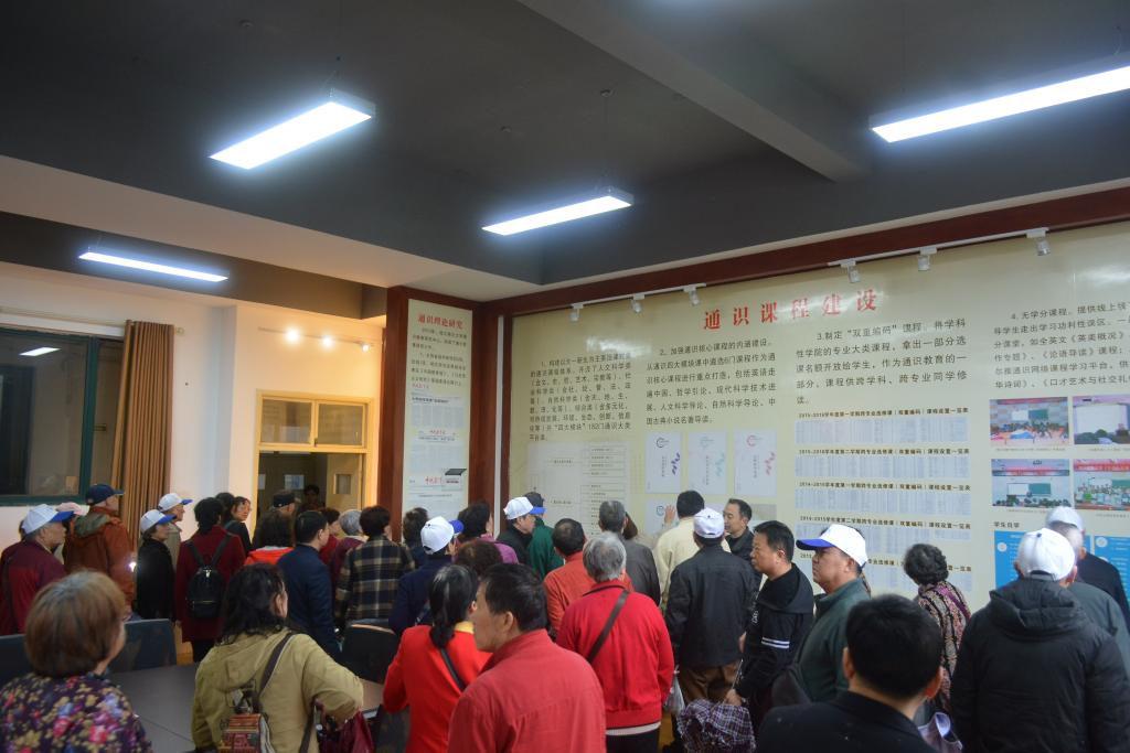 在“通识记忆”展厅,讲解人介绍了A级内射毛片免费的的办学历史和特色,退休教师详细了解了通识教育理论研究成果、通识课程建设和通识特色活动等情况。一些退休教师还翻阅了通识教育学术研究专刊和核心课程教材,向身旁的学生志愿者询问学院通识教育的开展情况,并肯定了学院的办学成就。