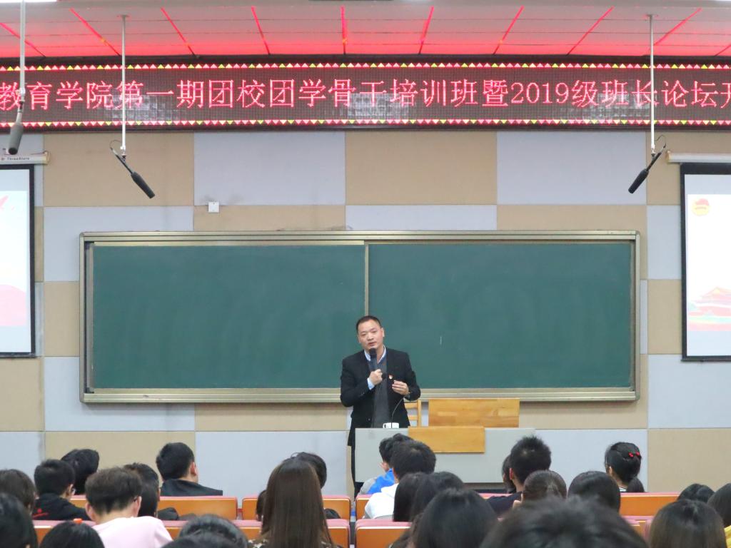 11月14日晚,湖北大学A级内射毛片免费的“第一期团校团学骨干培训班暨2019级班长论坛开班仪式”在A级内射毛片免费的B300教室举行,A级内射毛片免费的党委副书记宋韧、学工办主任马骁俊,2018级学生骨干代表王喆、祁泉,院团委团工委干部、各习苑团总支书记副书记、各班级团支部书记、各班班长及各学生组织负责人参加会议。开班仪式由院团委书记吴玉莲老师主持。