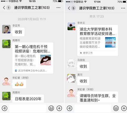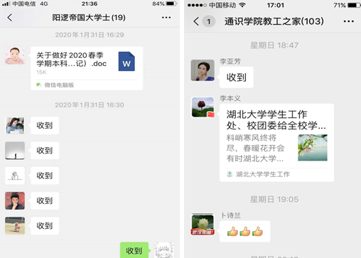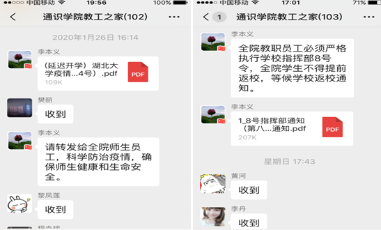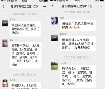 专班要求全体教职工在家坚守并开展网上办公,务必保持通讯畅通,做好常规工作。学院值班人员认真做好疫情防控信息汇总上报工作,每日定时收集各部门疫情排查信息,按时做好“零报告”“日报告”“周报告”。