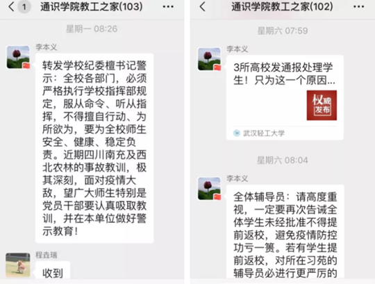 第一时间传达疫情防控指挥部的各项通知精神,坚持及时关注国家疫情最新动态,收集疫情防控工作中的典型案例,包括领导干部失职渎职、一线工作人员执行防控措施不力、学生提前返校受处分等,如黄冈卫健委主任唐志红、湖北红十字会3名干部防控失职和黄石鄂东医养集团党委书记违规问责等案例、长江云《关于6起疫情防控作风不实、履责不力典型问题的通报》、西北农林科技大学处分提前返校并瞒报的学生案例等,通过案例现身说法,积极开展警示教育,保持警钟长鸣。