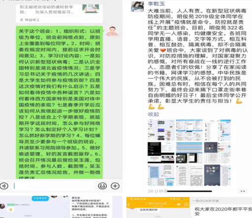 全体辅导员坚持严格按照学院统一部署落实好相关工作,扎实开展“疫情严防控 党员在行动”专项活动,在疫情防控中坚持“三个一”,即下好“每一盘棋”、实行“每日一报”、示范“每一方面”,组织召开“疫情就是命令、防控就是责任”网络特别主题班会活动,把有关学生疫情防控、开学准备、网上学习等相关信息及时准确传达到每一名学生。及时掌握学生的疫情防控和思想动态,严禁学生提前返校,坚决执行教育部和学校教务处的有关要求,做好网络教学前期准备工作。