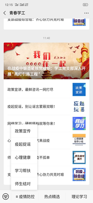 关心关爱患病学生。春节以来,学院共有4名学生回家后因家人感染而被隔离医学观察。期间,学工党支部辅导员党员始终与学生在一起,每日一排查,每日一提醒、每日一关怀,被学生亲切地称之为“患难之交的贴心守护者”。