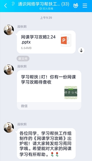 学习是学生的主要任务。为确保同学们“停课不停学、学习不延期、成长不掉线”,学工党支部成立了由4名党员辅导员和13名学生骨干组成的网络学习工作组,组织开展网络学习,指导各个班级成立网络学习兴趣小组和帮扶小组,抓好线上学业指导和学风建设。