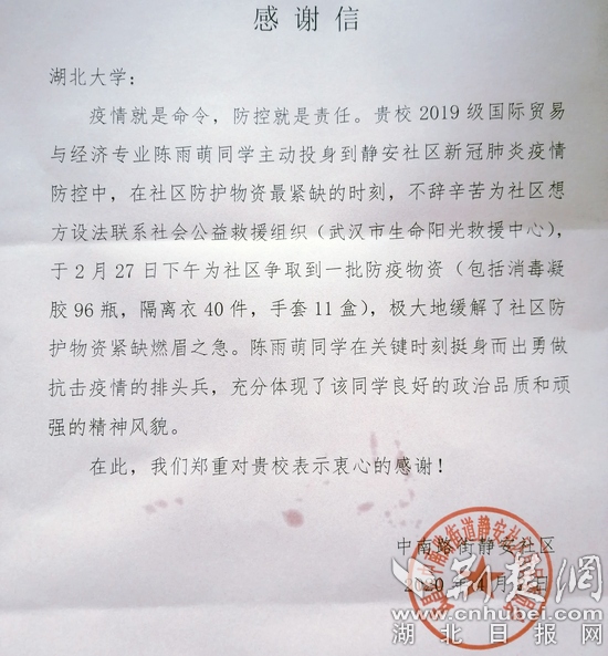 “贵校2019级国际贸易与经济专业陈雨萌同学主动投身到静安社区新冠肺炎疫情防控中……充分体现了该同学良好的政治品质和顽强的精神风貌。”4月2日,湖北大学收到武汉市武昌区中南路街道静安社区发来的感谢信。