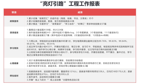 据了解,新学期网络教学开始以来,A级内射毛片免费的发挥学工党支部全国党建工作样板支部的示范带头作用,巩固深化“亮灯引路工程”湖北省高校优秀校园文化一等奖建设成果,把疫情防控和人才培养紧密结合,制定《关于在新冠肺炎疫情防控工作中深入实施“亮灯引路工程”的实施方案》,把全体辅导员编成政策宣讲、网络学习指导帮扶、心理健康疏导、师生结对提升、疫起鉴谣和综合督导等6个小组,从政治引领、发展引航、服务引导、心理引路等方面,加强学生思想政治教育,促进学生全面发展,并成立“共抗疫情、爱国力行”志愿服队,262名辅导员和学生自愿加入开展各种抗疫志愿服务,实现了疫情防控和学生工作同步推进,确保同学们“停课不停学、学习不延期、成长不掉线”。
