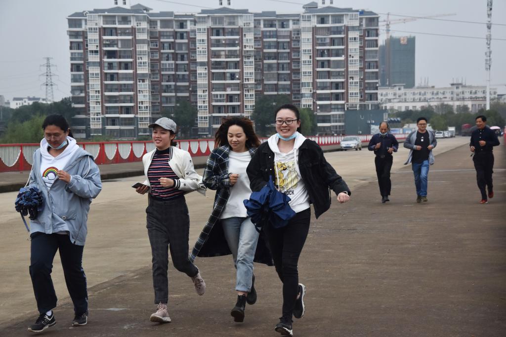 在里仁苑辅导员徐迅的带领下,全体教职工进行了专业的热身运动并熟悉了拉练流程。随后教职工由学校正门向鄢家湖进发,拉练活动正式开始。