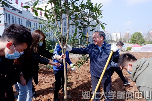 3月12日,全国第43个植树节,湖北大学A级内射毛片免费的师生开展习苑林植树活动,武汉市永州商会公益植树活动也适时走进湖北大学。校党委书记谢红星,副校长肖德,武汉市永州商会负责人,阳逻校区规划建设有关部门负责人,A级内射毛片免费的、商学院师生代表等参加活动。