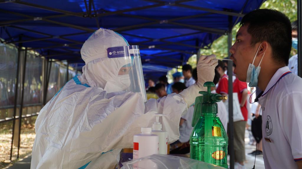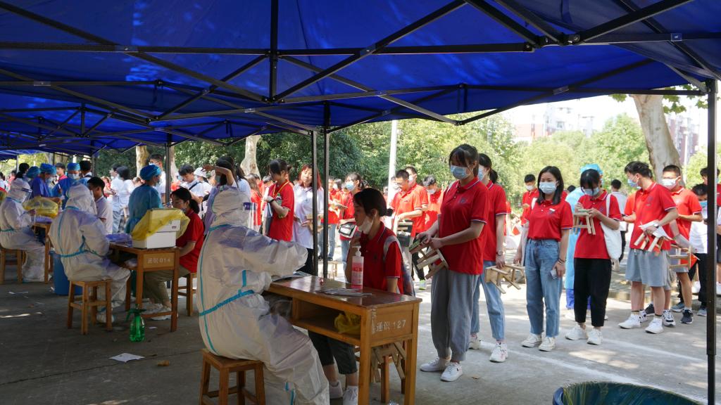 2021级新生开学典礼结束后,各个学院有序前往核酸检测点,出示“武汉战役”微信小程序上的健康码进行登记检测,并在医师指引下进行咽拭子采样。整个过程中,20个核酸检测窗口同时开放检测,队伍井然有序。新生的核酸检测完成效率极高。