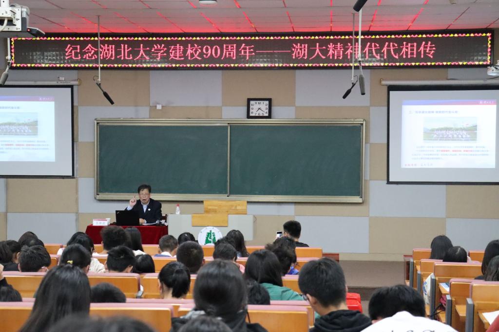 在报告会上,王体正详细讲述了湖北大学从上世纪30年代至今六更校址、八换校名的发展历史,其中包括奠基、调整、定向、发展四个阶段。他强调,正是艰难的过去才铸就了今日的辉煌。这一路的坎坷也磨砺了奋斗、进取、科学、奉献、坚韧、创新的湖大精神,王体正教授着重强调了其中的“奋斗精神”与“坚韧精神”。他指出,湖大精神中,有习于坎坷、自强不息的奋斗精神,而“习坎”精神的深刻内涵就是不畏艰难,不惧风险,拼搏前行。而对于日思日睿、笃志笃行的坚韧精神,他解释到“日思日睿”指思考问题要通达。笃志,即志建专一,专心致志;笃行,即一心一意,忠实执行。