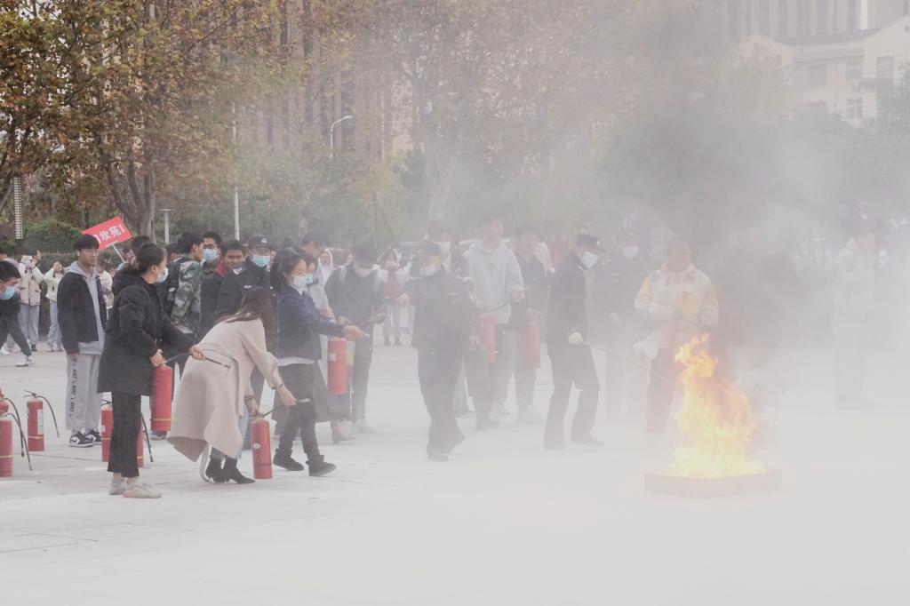 安全演练伊始,学院安保人员向学生介绍了灭火器的使用方法,讲解了其组成部分及功能。随后,安保人员点燃火堆,提起灭火器,拔下安全销,将喷嘴瞄准火苗根部并压下手柄,扑灭了火焰。在安保人员的指导下,学生们按照操作方法进行了现场灭火演练。