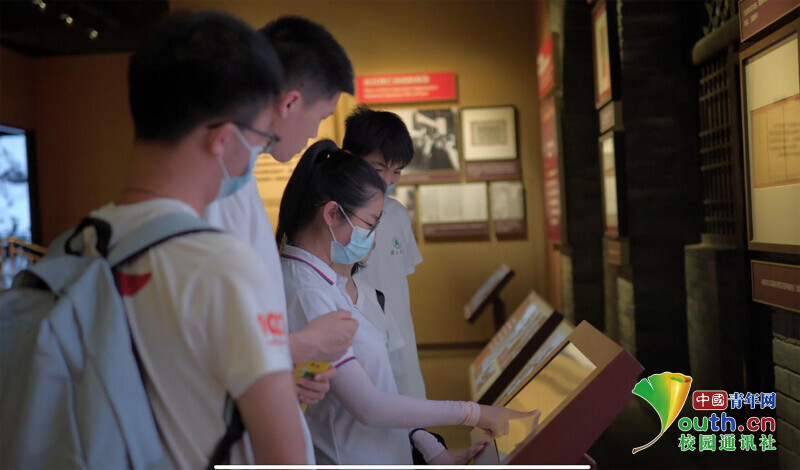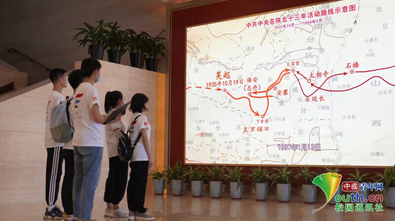 图为实践队员在延安革命纪念馆观看中共中央在陕北活动图。中国青年网通讯员 张萧之 摄