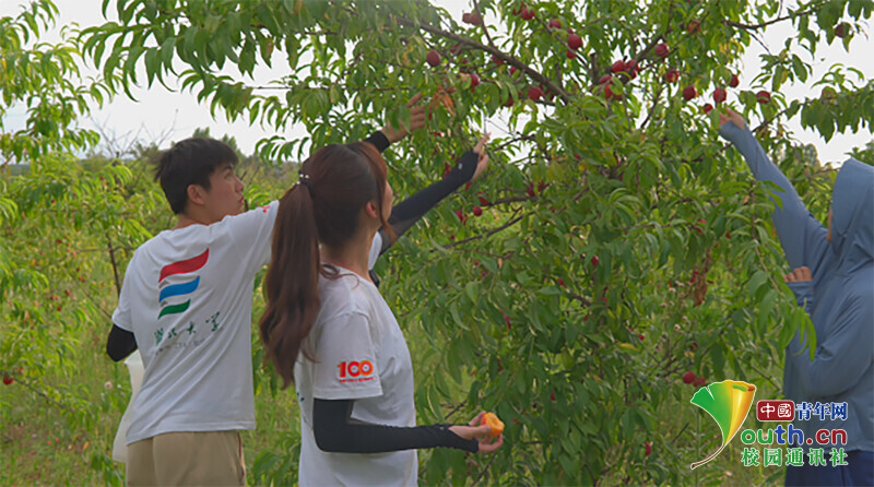 图为实践队员在新未来劳动教育研学实践基地采摘桃子。 中国青年网通讯员 张萧之 摄