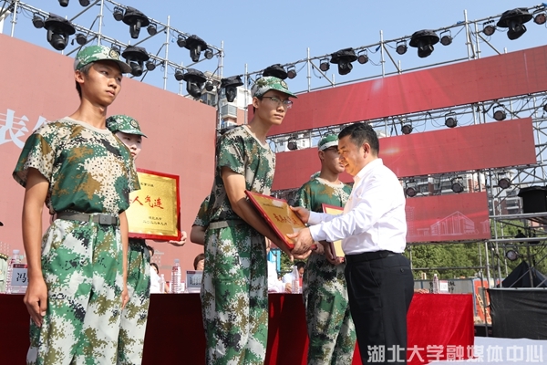 副校长王世敏、军训旅负责人分别宣读军训表彰文件,授予军体拳等3个方队“优秀方队”荣誉称号,授予一连一排等18个排“训练优胜排”、三连等10个连“队列先进连”、七连等3个连“军训最具人气连”荣誉称号,授予肖流泉等37人“优秀教官”、史健桥等9人“优秀指导员”、张雅洁等542人“优秀学员”荣誉称号。主席台就坐领导分别为受表彰的先进集体和优秀个人颁奖。