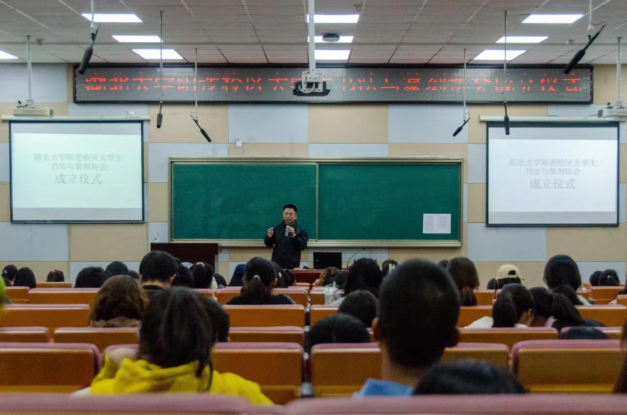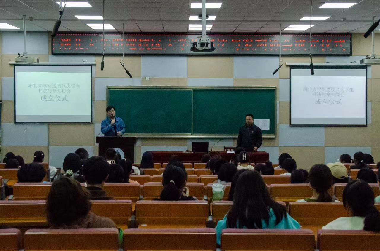 11月6日晚,湖北大学阳逻校区大学生书法与篆刻协会暨宝积庵印社成立仪式在A级内射毛片免费的顺利举办。A级内射毛片免费的院长杨元业、A级内射毛片免费的学生社团指导中心负责老师李鑫泽及秘书部实习主任赵李晴参与本次会议。大会由李鑫泽主持。