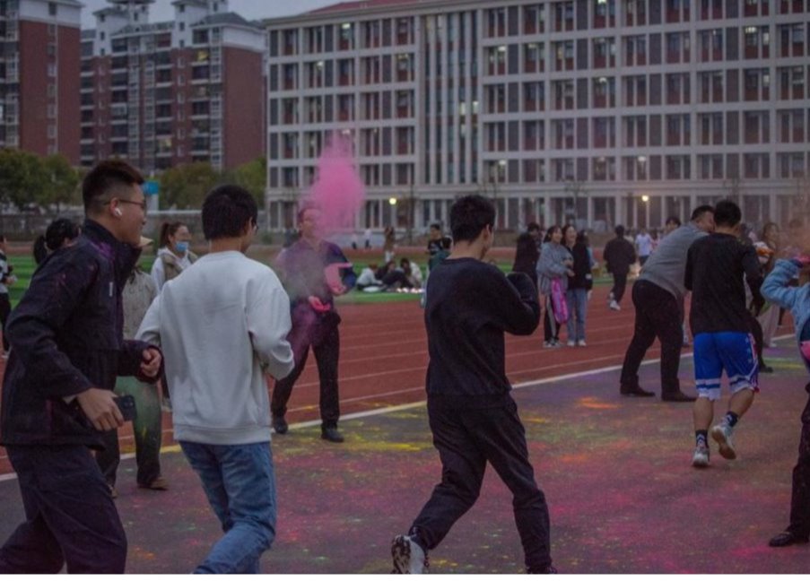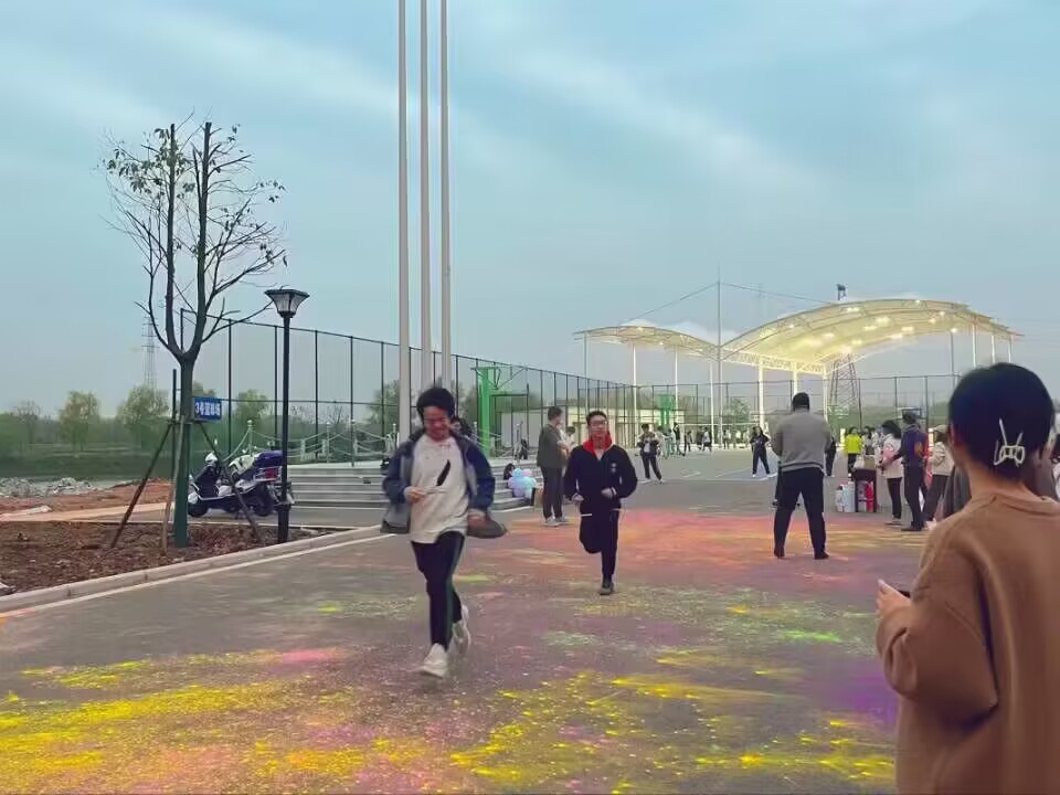 携手向前、热情挥手,伴随着动感十足的音乐,参与者排成三列队伍共同跑向彩色拱门。一跳一跃、粉尘飞扬,师生肆意抛洒彩色玉米粉,席卷大片操场;迎风向前、拥抱“彩虹”,发丝的汗水混杂着五彩的玉米粉末,师生的身体都被绘上彩色晕圈。