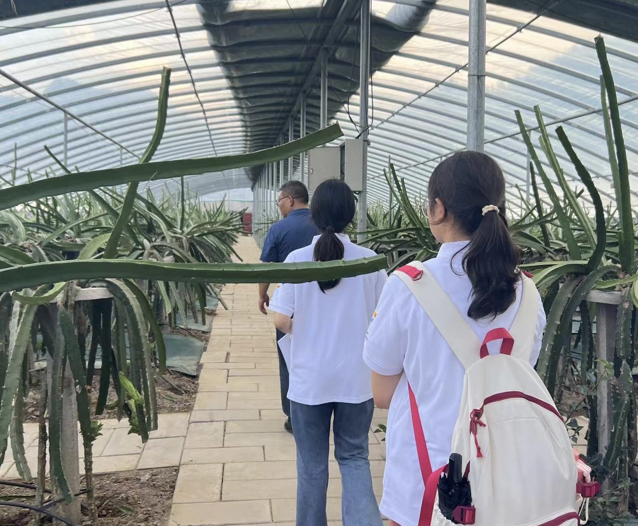 实践团队来到吕家河村太子道蓝莓和火龙果产业基地,在果茶农业合作社负责人的引导下,队员了解了蓝莓和火龙果基地产业的基本情况、带动效果、未来发展规划、产业创新点和发展痛点等情况。果茶农业合作社通过向村民招工的形式对蓝莓进行采摘,并以支付劳务的形式切实带动经济发展。与村集体以合作社的形式每年进行分红作为经济收入带动吕家河村发展。实践队员们对蓝莓有了更深刻的了解,负责人还十分热情地请我们品尝了天然蓝莓干果制品和当地特色香梨,切实地体会到了截枝育苗正当时。