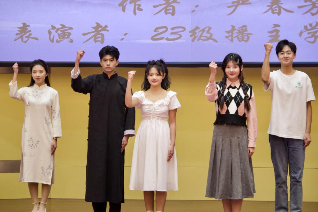 “我们是新传人,承接你星火的传播……”2023级播音与艺术专业学生共同诵读了严春芳为我校新闻传播学院十周年志庆写的诗歌《致敬,湖大新传》,拉开了比赛的序幕。