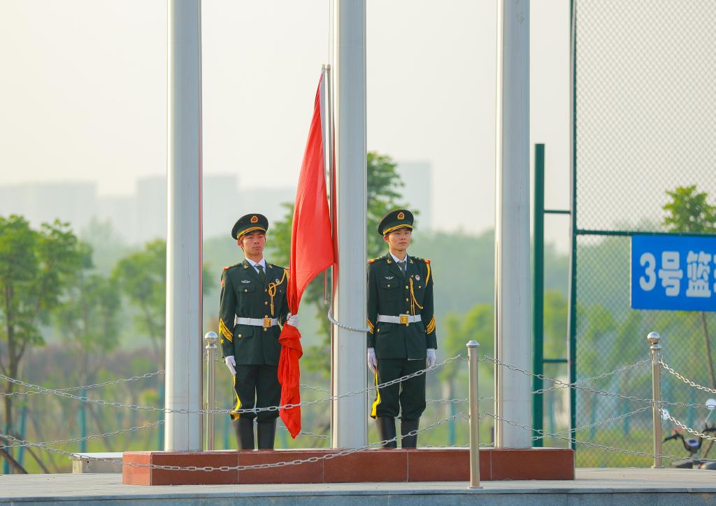7时整,伴随着《义勇军进行曲》慷慨激昂的旋律,五星红旗冉冉升起,全体师生向国旗行注目礼并高唱国歌。