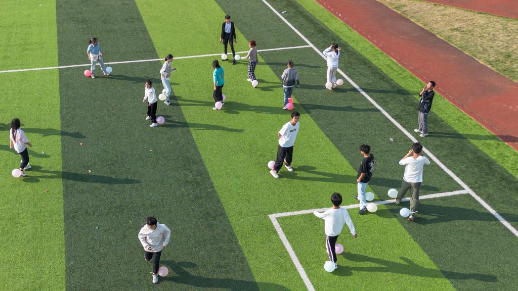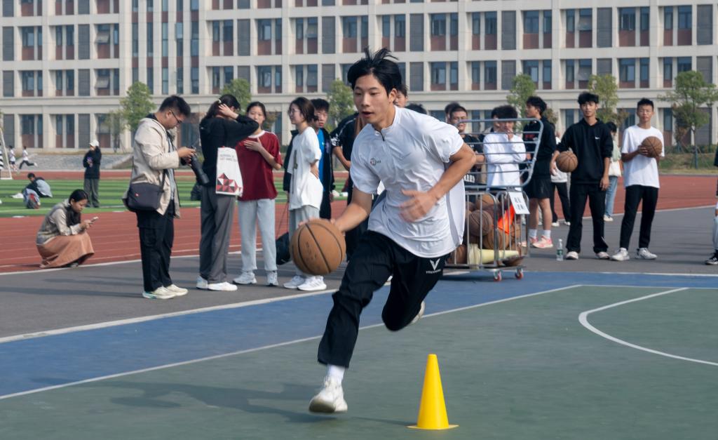 此外,3号篮球场上的篮球技巧大赛也异常激烈。参赛选手们运球绕过障碍物,上篮进球,传球绕返,再次跃起投篮,动作流畅而精准。2024级中国语言文学专业学生张桉和国际事务与国际关系专业学生魏子涵分别摘得男女生组桂冠。参赛选手刘艳表示:“上场前我很紧张,但当我真正投入比赛时,就仿佛进入了一个忘我的状态。”