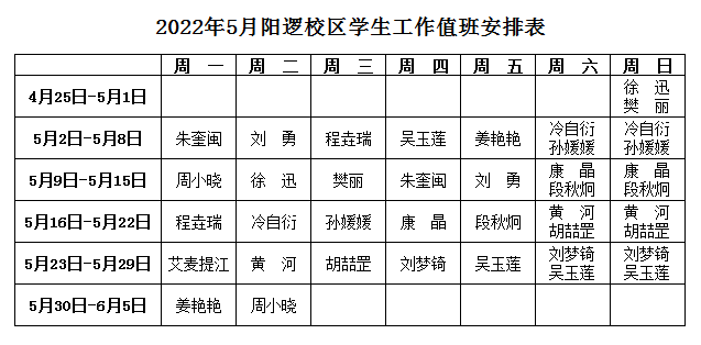 为进一步做好阳逻校区学生思想政治教育和管理服务工作,及时了解学生日常生活和思想动态,不断加强调研与沟通工作,确保阳逻校区的安全和谐稳定,校区严格执行辅导员值班制度。现将2022年5月学生工作值班安排附后,请有关人员按照值班安排表做好值班工作。