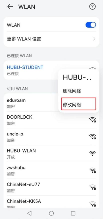 以下是我们以连接HUBU- STUDENT为例,整理的“随机MAC地址”关闭方法,用户可在选择学校的无线信号(SSID为HUBU-WLAN或HUBU-STUDENT)时分别设置。