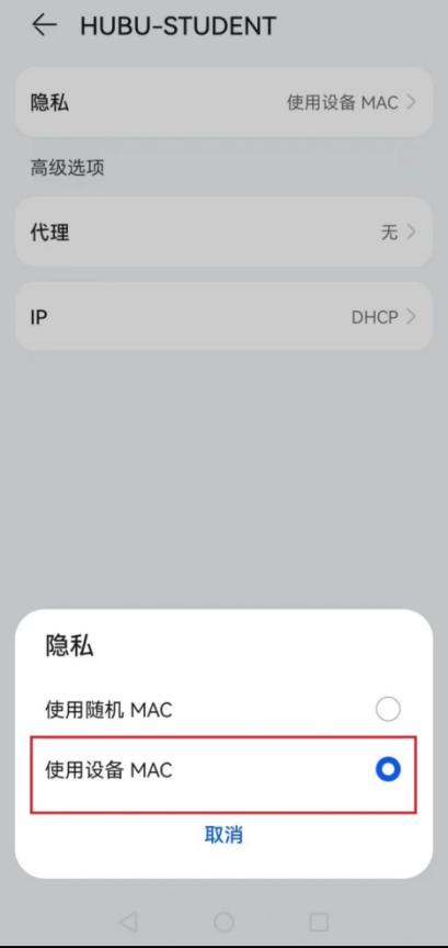 连接HUBU-STUDENT后,在网络设置对话框点击“修改网络”,勾选“显示高级选项”,在隐私里将使用随机MAC改为使用设备MAC,如下图所示: