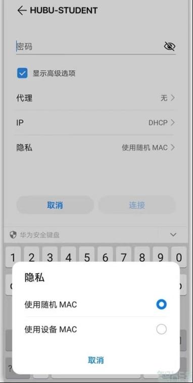 连接HUBU-STUDENT后,在网络设置中长按HUBU-STUDENT网络,此时会出现“修改网络”,勾选“显示高级选项”,在隐私里将使用随机MAC改为使用设备MAC,如下图所示: