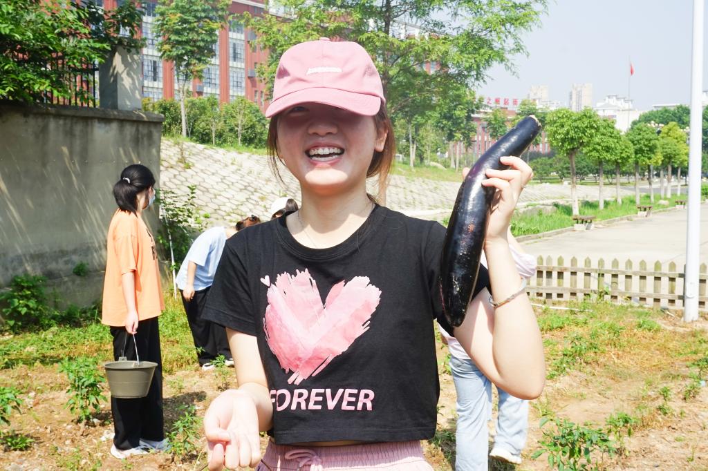 菜园里都是学生早期种下的不同种类的蔬菜:除了今天采摘的主角——茄子、辣椒、四季豆,旁边还有半米高的玉米苗、裸露在泥土外的南瓜藤和红薯叶,指导老师李少华说:“等你们放暑假时,这些也可以丰收了。”李少华老师对采摘事项简单讲解后,学生们便拿起装菜的提桶跃跃欲试。他们或轻轻扒开黄瓜藤叶,寻宝似地搜寻着黄瓜;或手脚麻利,一掐一拔摘下茄子;或小心翼翼,一株接一株地摘下青椒和四季豆。不一会儿,桶里就装满了沉甸甸的丰收果实。学生们共摘了满满的六七桶蔬菜,据指导老师李少华介绍,这些新鲜蔬菜将送往食堂加工,成为学生们的盘中餐。采摘现场火热朝天却又不失秩序,到手的作物有大有小,学生们比谁摘到的果实更大,欢声笑语,不亦乐乎。