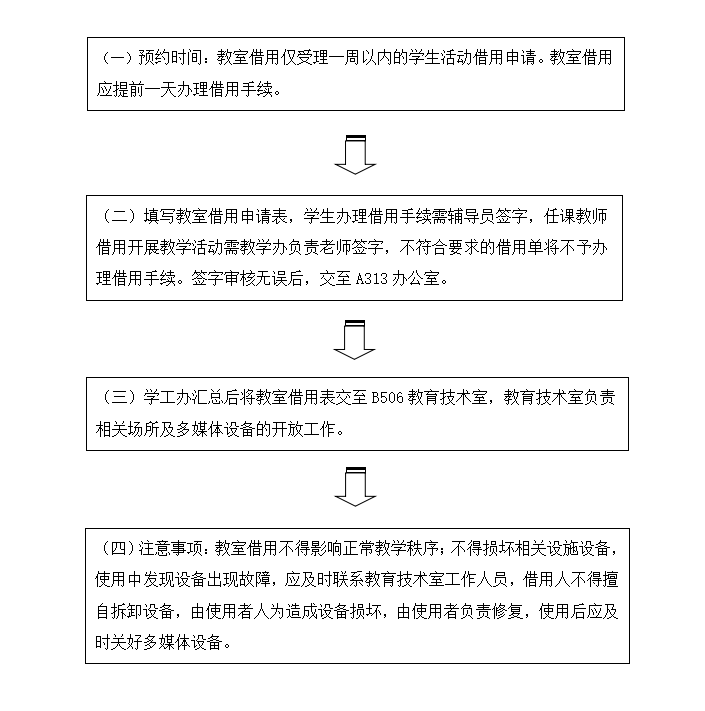 一、教室等场所及多媒体设备借用由学工办和教育技术室共同负责,学工办负责借用审批和场所调配工作,教育技术室负责相关场所及多媒体设备的开放工作。